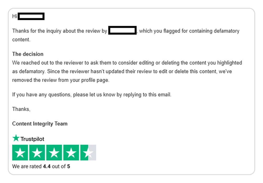 In the United States, the Consumer Review Fairness Act protects genuine customer feedback but is against fraudulent or defamatory content. From our experience working with the moderation team, Trustpilot is one of the most flexible and responsive review platforms for content removal, but I have news for you.