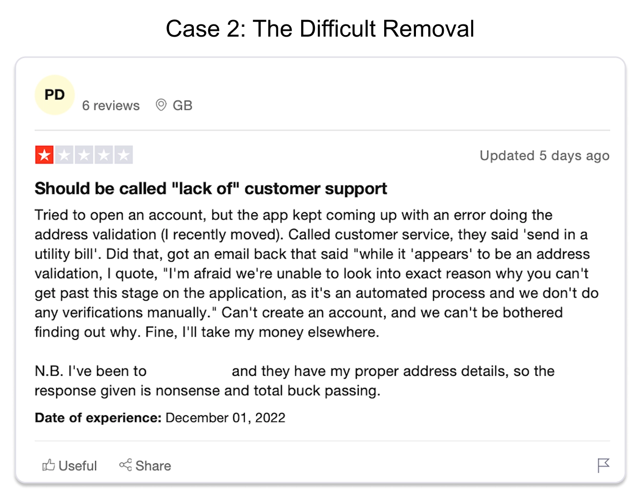 The hardest removal category is reviews from real customers describing genuine experiences in detail and with evidence. If the fundamental facts of the dispute are accurate, Trustpilot protects these reviews as legitimate consumer experiences regardless of tone or business impact.